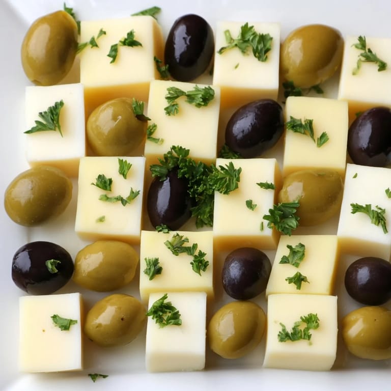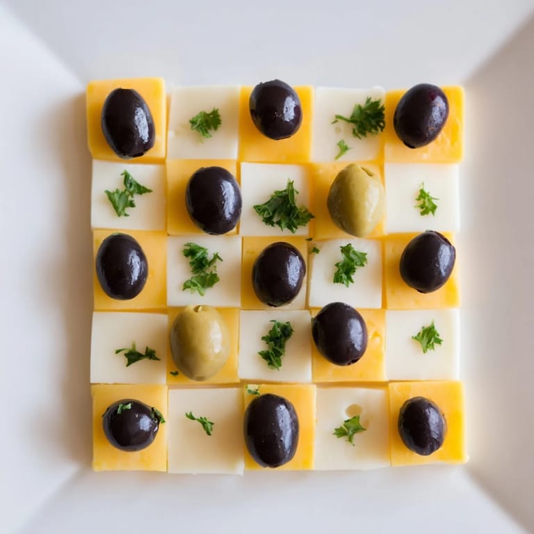 Pin it A visually striking appetizer featuring alternating cubes of cheese and olives arranged like a chessboard. Perfect for parties and gatherings.