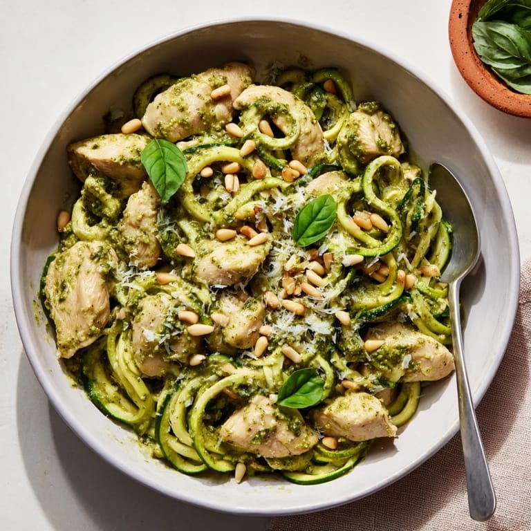 Pin it The smell of basil on a cutting board still makes me think of late summer evenings when I wanted something fast but not boring. I had bought a spiralizer on a whim and didnt know what to do with it until I stood in front of a pile of zucchini at the farmers market. This bowl came together almost by accident, just chicken, pesto, and ribbons of zucchini that cooked in minutes. It felt like cheating because it tasted so bright and full without any of the heaviness I was trying to avoid.