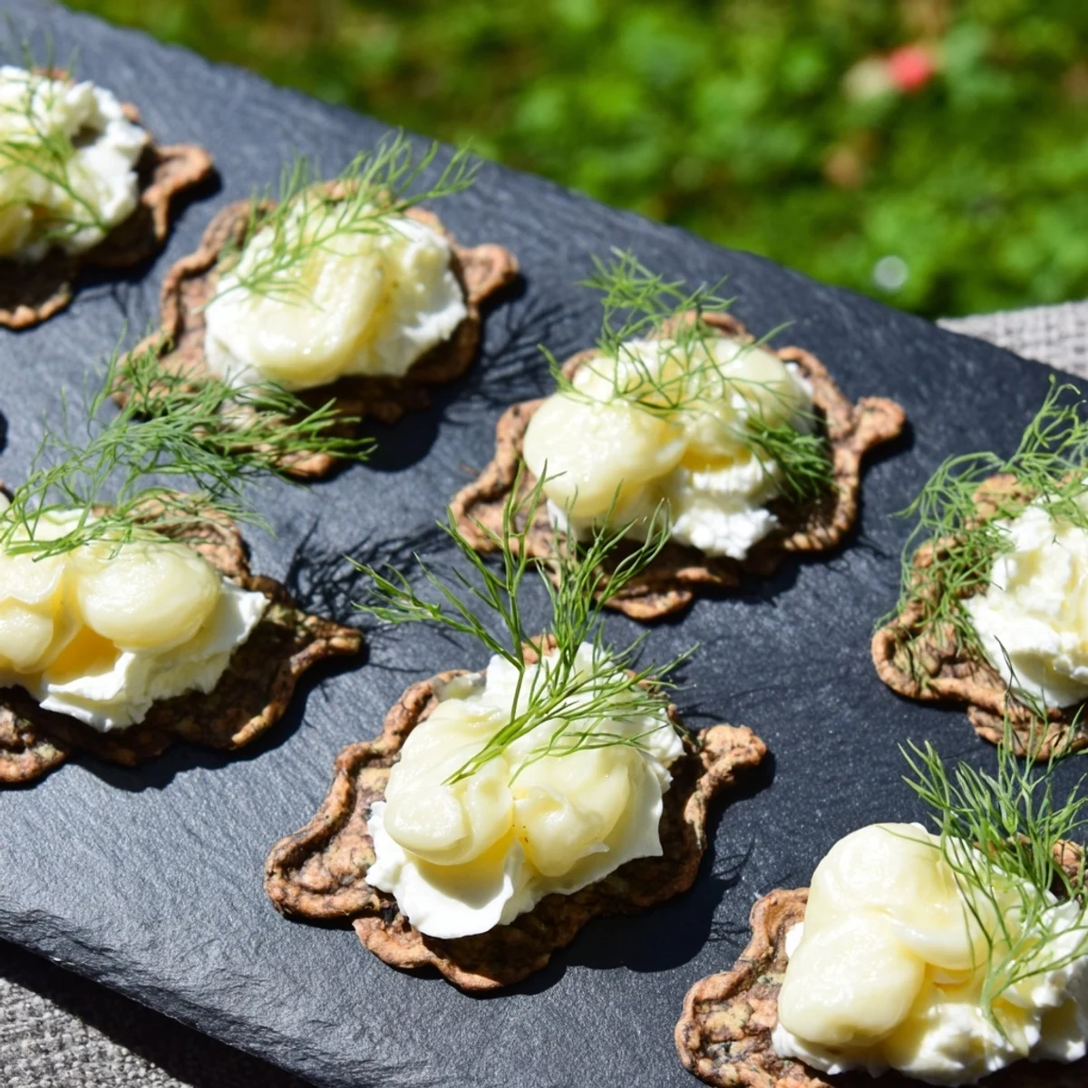 - Place a single frond of dill or tiny edible flower on top of each mound if you're using them, then step back and look at what you've made. It should feel like a miniature world on that dark blue surface.