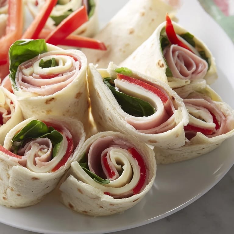 Pin it Savory turkey and creamy provolone cheese are wrapped in soft tortillas with fresh vegetables and a flavorful spread, creating the perfect bite-sized snack or light lunch for the whole family.
